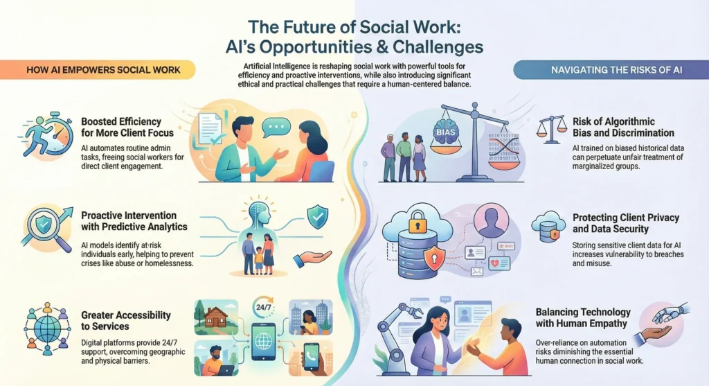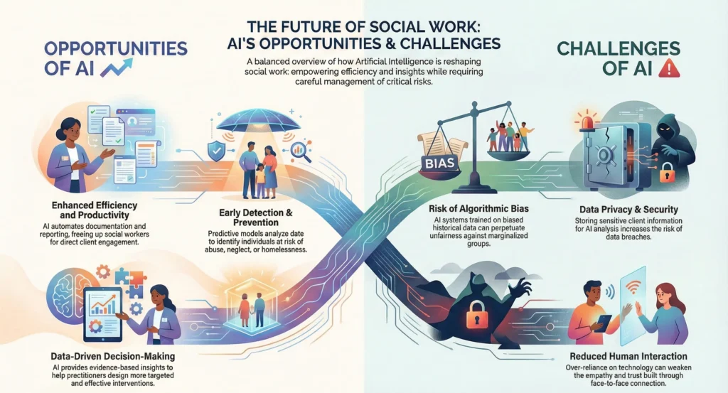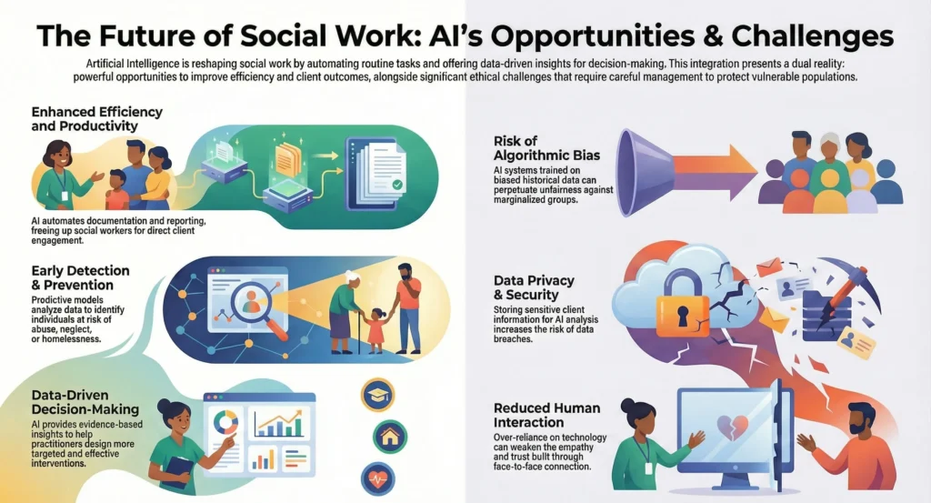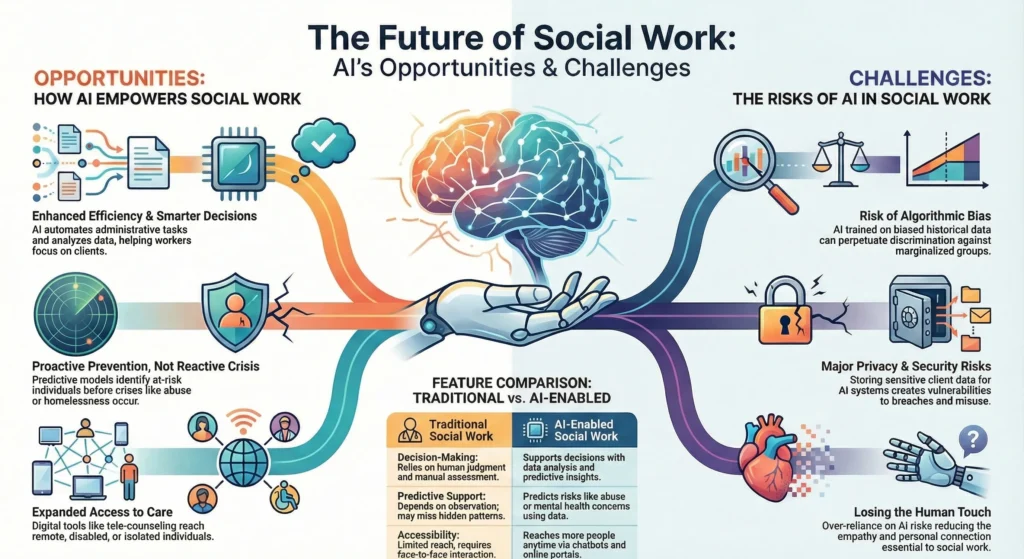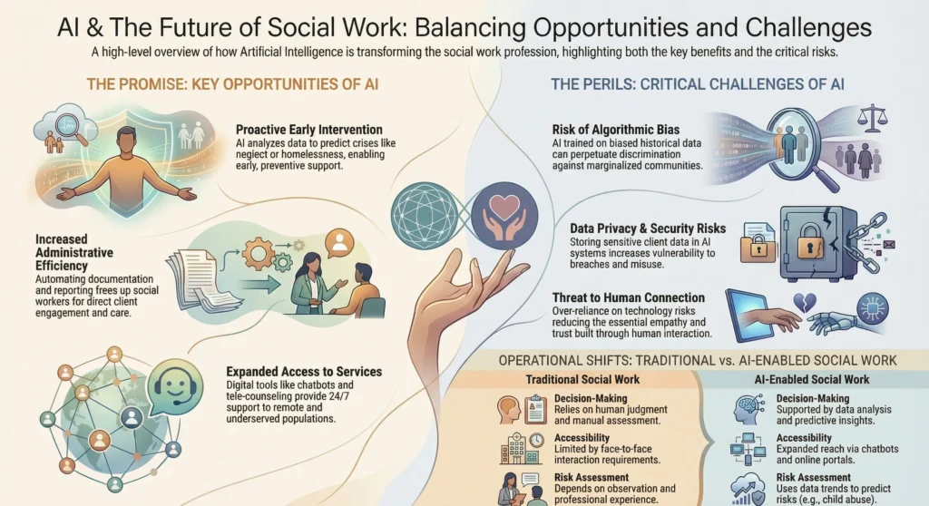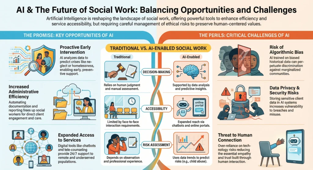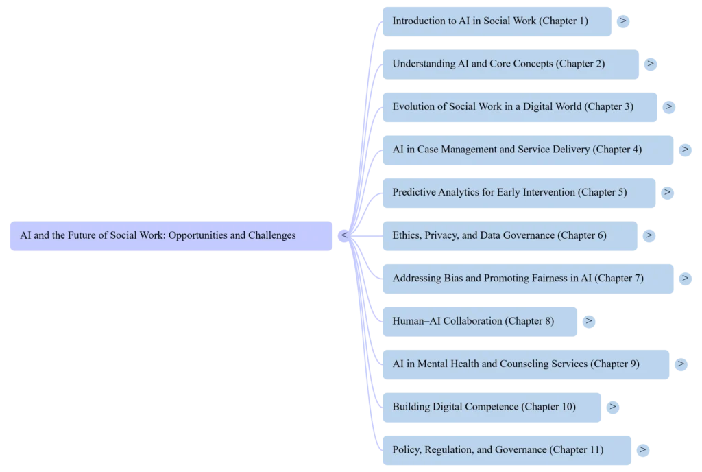 The book begins by situating AI within the broader digital revolution in human services, tracing how social work has evolved from manual, relationship-based practices to data-informed and technology-supported systems. It explains core AI concepts—such as machine learning, natural language processing, and predictive analytics—in accessible language, ensuring that readers without a technical background can build strong AI literacy. Throughout the text, AI is framed not as a replacement for human judgment and empathy, but as a tool that can augment decision-making, enhance early intervention, and improve service efficiency when used responsibly.