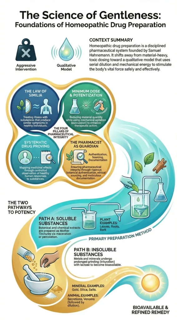 Homeopathic Drug Preparation: Principles, Potencies & Practical Techniques is a comprehensive and authoritative text designed to bridge classical homeopathic philosophy with modern pharmaceutical practice. The book presents a systematic and scientifically structured approach to the preparation, standardization, and dispensing of homeopathic medicines, making it an essential resource for students, educators, pharmacists, and practitioners of homeopathy.